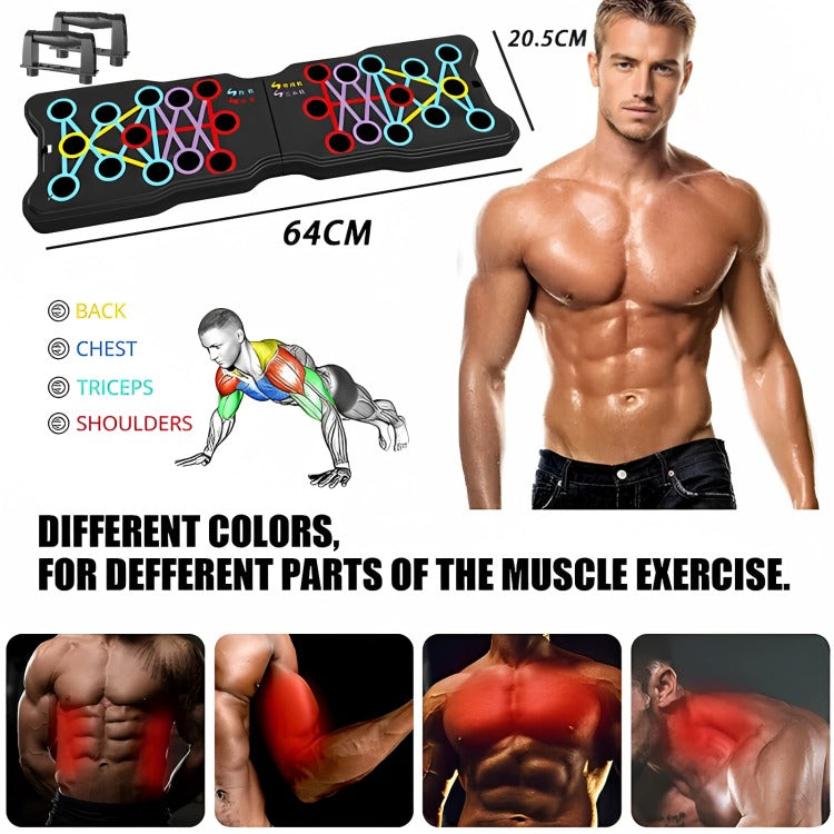The Multi-Function Push Up Board designed to enhance your upper body strength and overall fitness level. This foldable push-up rack features a unique color-coded system that targets specific muscle groups, allowing you to customize your workout and achieve optimal results.
